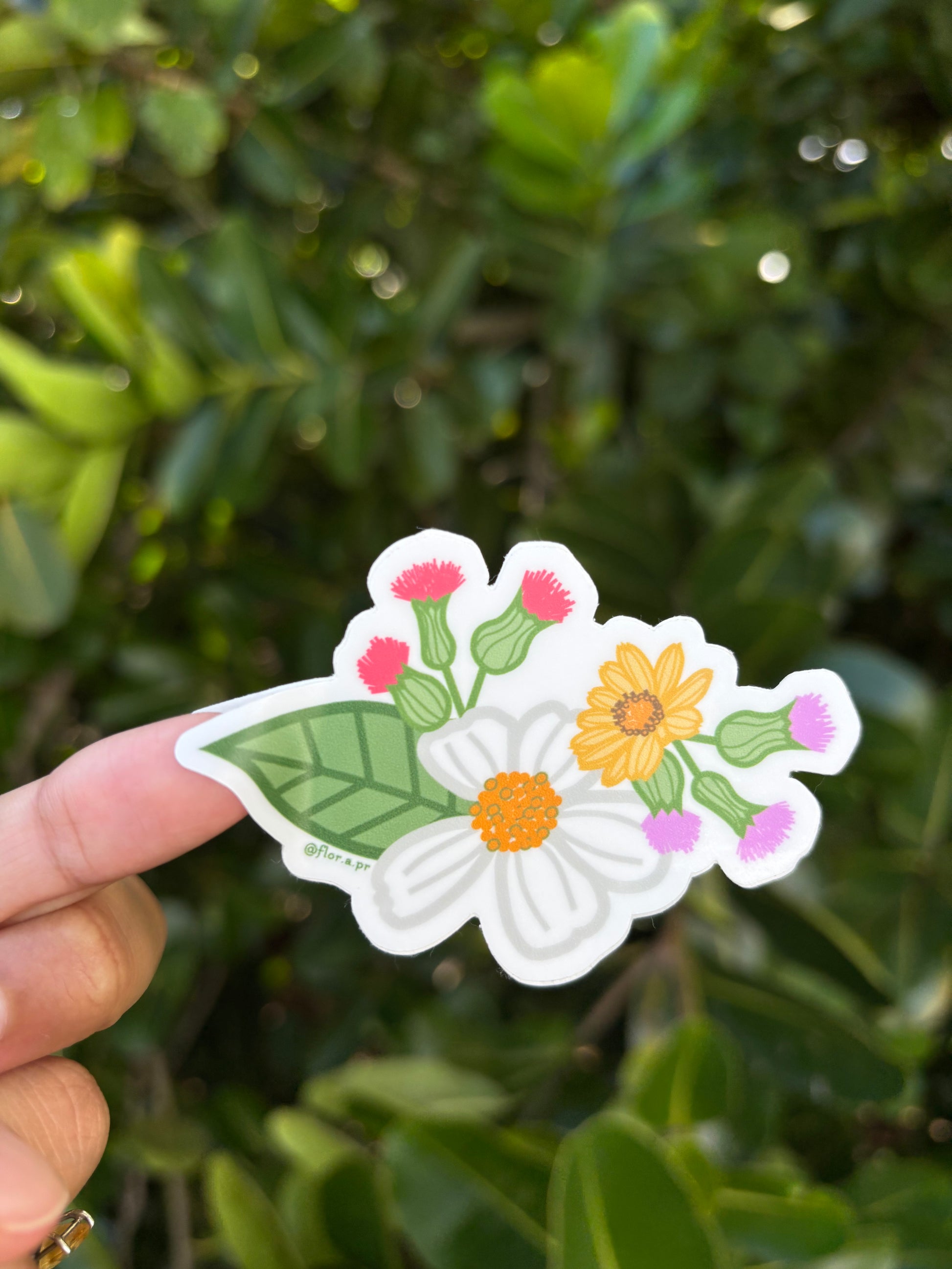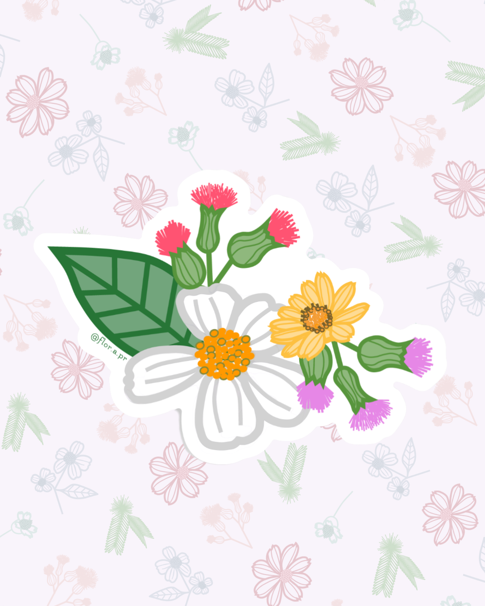 Macito silvestre con margarita silvestre, wedelia, clavelillo rojo y morado.